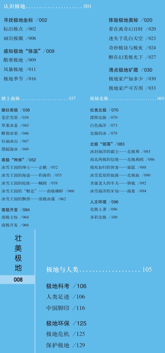 描述 :巍峨的雪原、堆砌的冰川、蔚蓝的大海构成了地球上最为壮美的画面,神奇的极昼极夜、美妙的极光、奇特的幻日蕴涵着无数的科学之谜,企鹅、北极熊、海豹、北极燕鸥、旅鼠等众多生灵给冰天雪地平添了一份热闹景象;阿蒙森、斯科特、皮尔里等一个个耳熟能详的名字谱写了极地探险的壮丽诗篇。